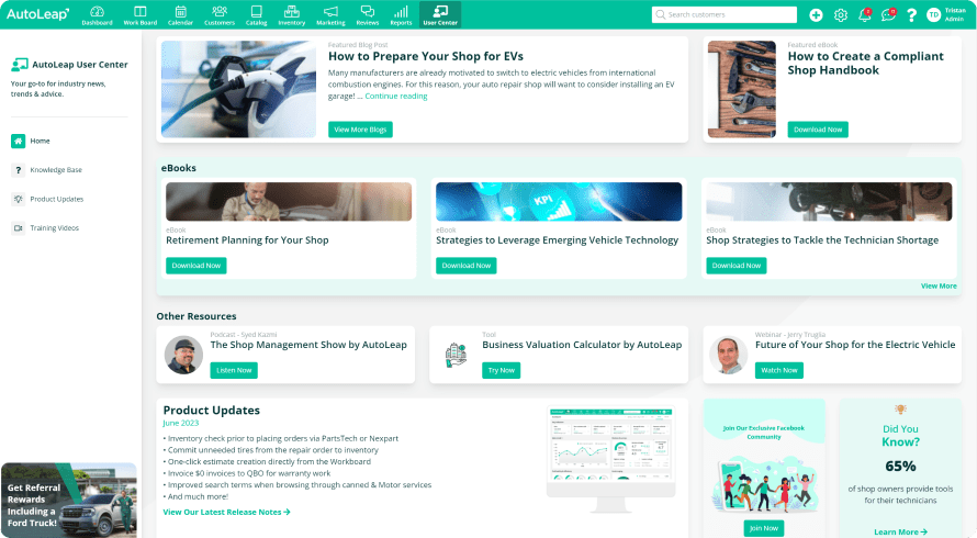 The auto repair industry is changing rapidly and it’s important to keep up! AutoLeap’s User Center provides a one-stop library for industry-leading content generated by AutoLeap. From thoroughly researched eBooks to webinars by auto repair experts, learn more about the industry through the User Center!