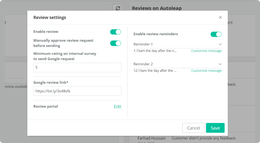AutoLeap has two levels of reviews for your business. The first level allows you to collect internal reviews for your business, while the second level sends a follow-up message to select customers who match your criteria to leave a review directly on Google!