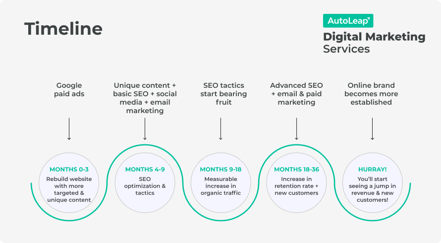 We remove the stress of marketing campaigns from your shoulders by providing you with a variety of services that help you consistently attract new customers while retaining existing ones! If you’d like to know more about our Digital Marketing Services package, email us at sales@staging.autoleapmarketing.com.