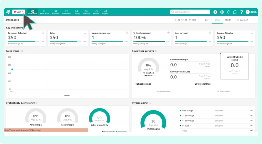 For existing AutoLeap customers, you won’t feel much of a difference when checking information for different locations. Just use the app as you would normally and when you want to check the data for a specific location, simply navigate to the “Location” tab on the top right. From there, you can select a specific location as you wish.