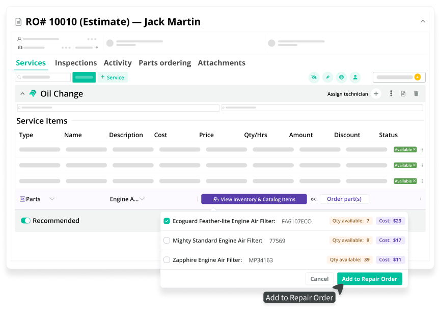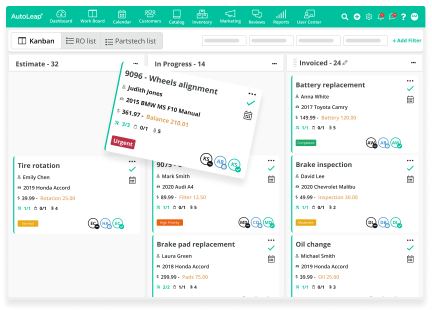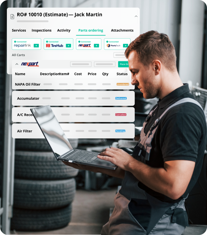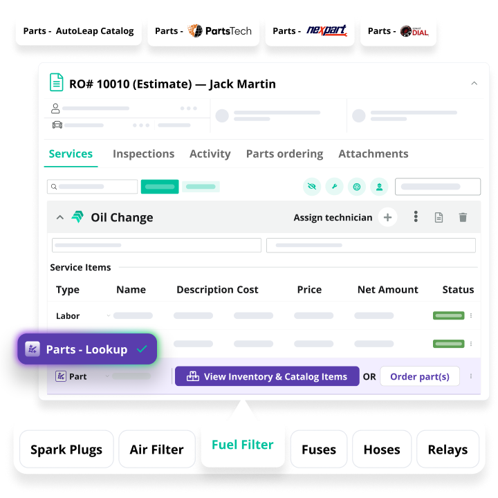 AutoLeap has partnered with reputable vendors such as PartsTech, Nexpart, TireHub, and more to order parts. You can search for and order any part, then track its status in the Workboard.