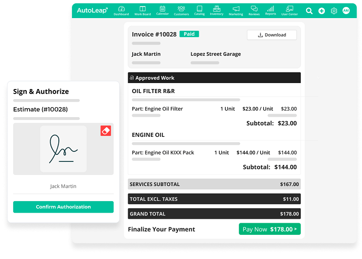 AutoLeap’s payment software is designed to make your shop run smoothly, protect your business and delight your customers, all without stretching your budget. Affordable, intuitive and packed with features, it’s made for modern auto repair shops.
